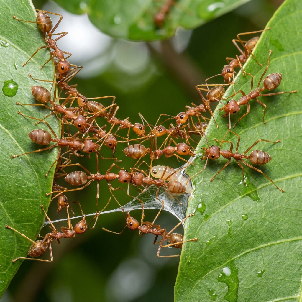 Dozens or even hundreds of weavers ants cooperate to bind leaves together. To reach distant leaves, ants will form a chain, bridging the leaves. Situated along the edges like staples, they grab one leaf with their mandibles, the other with their legs, and pull!